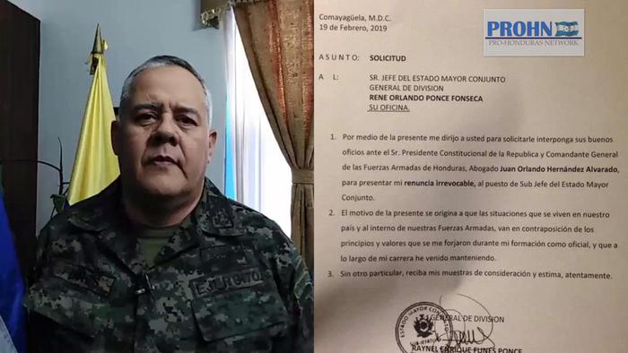 El segundo al mando en el Estado Mayor Conjunto de las Fuerzas Armadas de Honduras (FFAA), Reynel Fúnez, entregó este viernes su renuncia a Juan Orlando Hernández.
