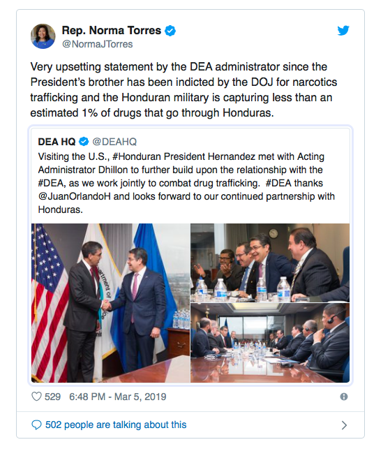 Torres, congresista por el distrito de California, reaccionó indignada vía Twitter, tras la publicación de la cuenta oficial de la DEA, en la cual, anunciaron la productiva reunión que tuvieron con Hernández y que esperan seguir trabajando con el. Torres aprovechó para recordarle a la DEA quien es Hernández.