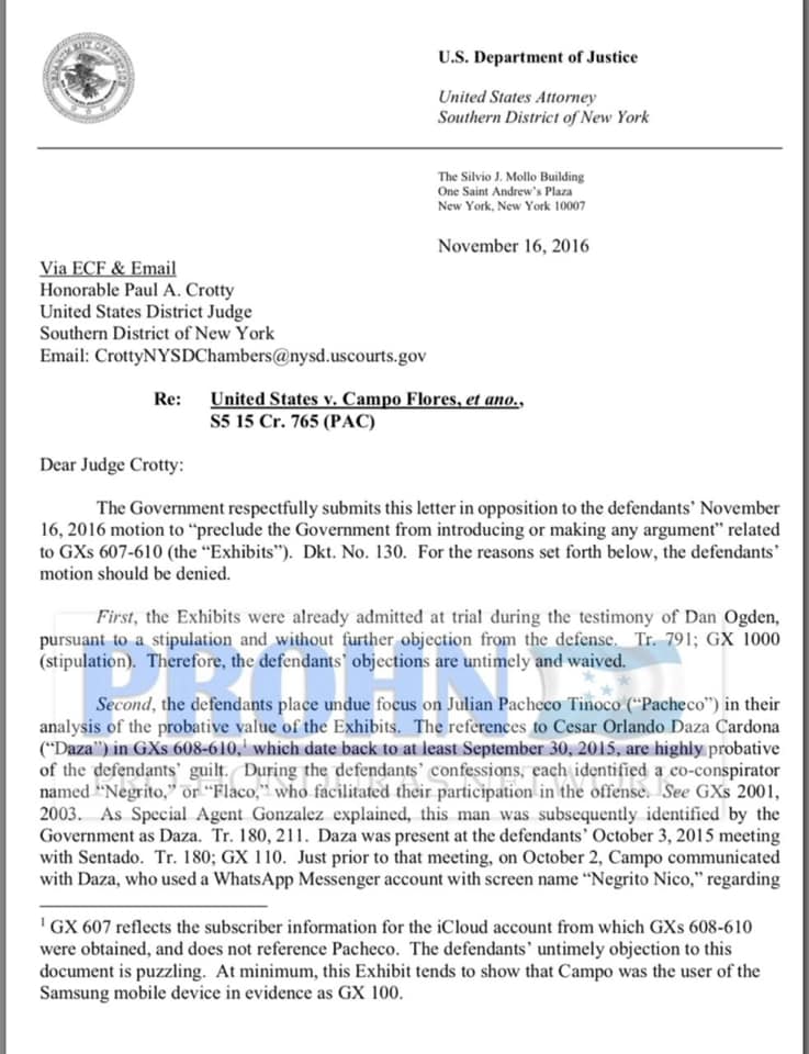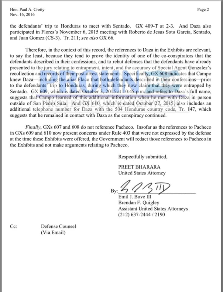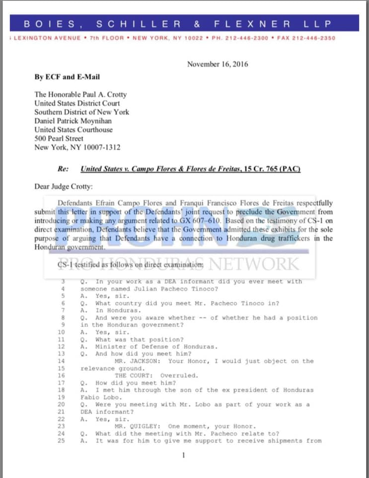 En una carta dirigida a la corte el 16 de noviembre de 2016, la defensa de los narco-sobrinos acusaron a la fiscalía de haber admitido información que relaciona a Julián Pacheco Tinoco con «el único propósito de argumentar que los acusados tenían conexión con los narcotraficantes del gobierno hondureño».