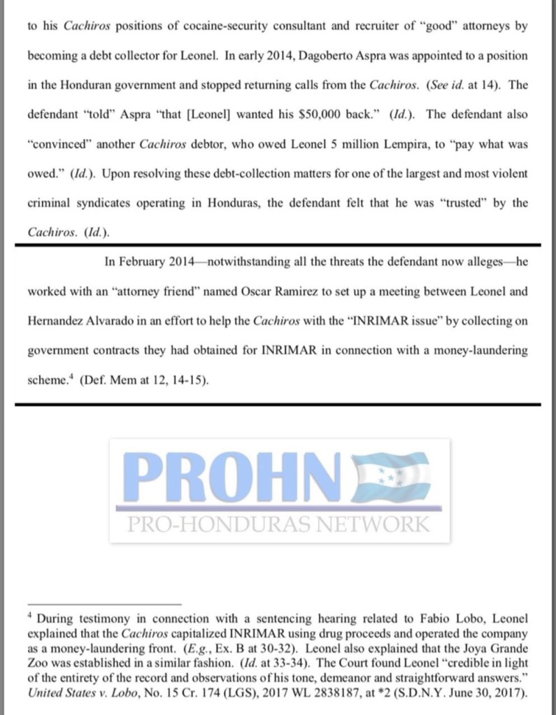 El documento también afirma que Avila Meza y Ramírez crearon «una empresa ‘frontal’ que utilizaron para «recuperar» 21 millones de Lempira «adeudada por el gobierno hondureño» a los Cachiros, ya que el gobiernono habría pagado estos fondos a los Cachiros o INRIMAR directamente, la fiscalía menciona que «El problema era que el INRIMAR había sido congelado en virtud de las sanciones de la OFAC, y que se necesitaba una nueva entidad» para efectuar el pago.