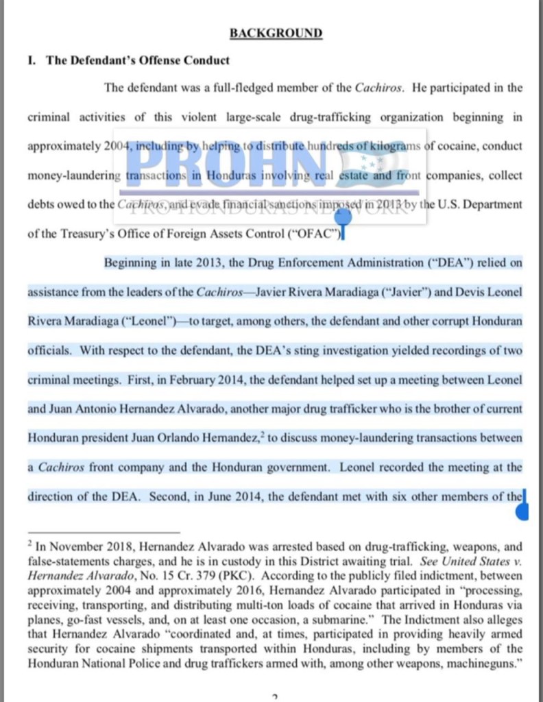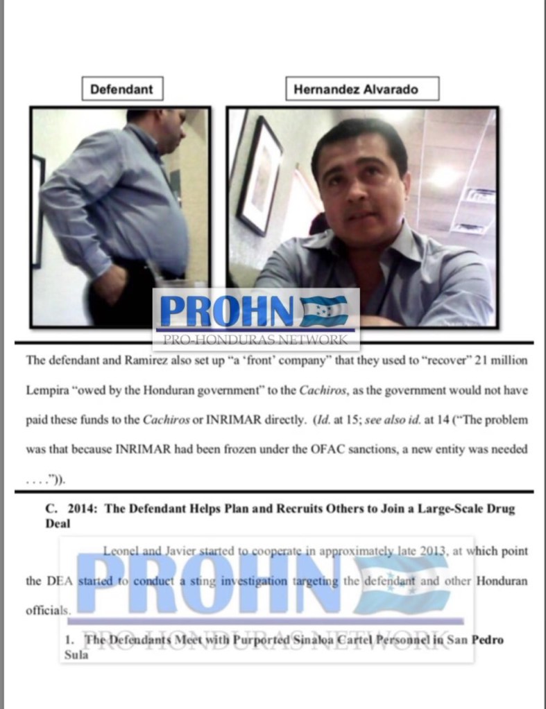 Además, en el extenso documento se menciona que Ávila Meza fue la persona encargada de organizar la reunión llevada a cabo el 2013, entre Devis Leonel Maradiaga y Juan Antonio Hernández, asegurando que, a partir de finales de 2013, la Administración antidrogas («DEA») confió en la asistencia de los líderes de los Cachiros -Javier Rivera Maradiaga («Javier») y Devis Leonel Rivera Maradiaga («Leonel») para atacar, entre otros, al acusado y a otros funcionarios hondureños corruptos, respecto a Ávila Meza, la investigación de la DEA muestra la existencia de dos reuniones en las que el acusado participo. Primero, en febrero de 2014, la fiscalía asegura que el acusado ayudó a establecer una reunión entre Leonel y Juan Antonio Hernández Alvarado, refiriéndose a Hernández como «otro gran narcotraficante que es hermano del actual presidente hondureño Juan Orlando Hernández» además, la fiscalía asegura que la reunión se llevo a cabo con el fin de «discutir transacciones de lavado de dinero entre una empresa líder de Cachiros y el gobierno hondureño», Leonel grabó la reunión bajo la dirección de la DEA