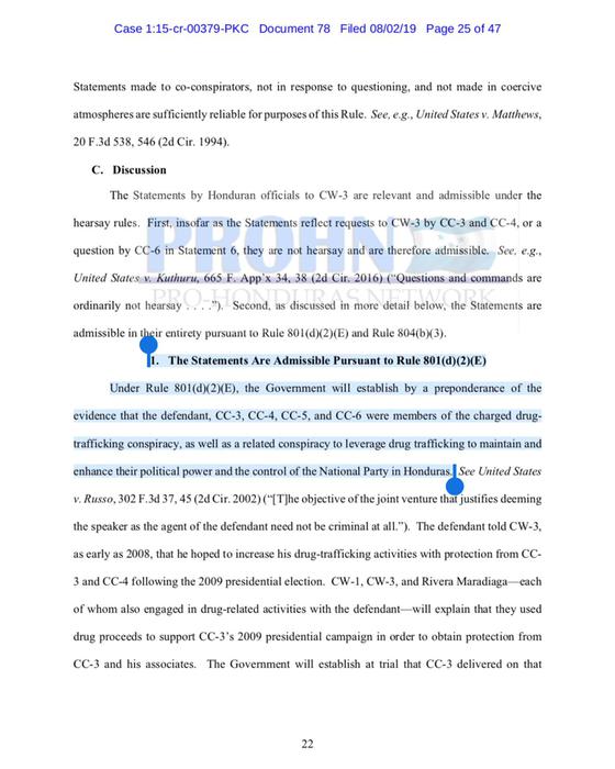 Bajo la Regla 801(d)(2)(E), el Gobierno establecerá por preponderancia de la evidencia que los acusados, CC-3, CC-4, CC-5, y CC-6 eran miembros del complot de tráfico de droga acusado, así como de un complot relacionado con la influencia en el tráfico de drogas para mantener y aumentar su poder político y control del Partido Nacional de Honduras. United States v. Russo, 302 F.3d 37, 45 (2d Cir. 2002) («El objetivo del proyecto conjunto que justifica considerar al locutor como el agente del acusado no necesita ser criminal»). El acusado le comunicó a CW-3, En el 2008, que esperaba incrementar sus actividades de tráfico de drogas con la protección de CC- 3 y CC-4 después de las elecciones del 2009. CW-1, CW-3, y Rivera Maradiaga-quienes también se vieron involucrados en actividades relacionadas con el tráfico de drogas con el acusado- explicará que utilizaron ingresos de la droga para apoyar la campaña electoral de CC-3 en el 2009 para así poder obtener protección de CC-3 y sus asociados. El gobierno establecerá en el juicio que CC-3 actuó bajo esa promesa. Por ejemplo, CW-3 testificará que aproximadamente en el 2010, luego de que CW-3 discutiera el asunto con el acusado y luego CC-3, CC-3 ayudara a desplegar las fuerzas militares a la frontera con Guatemala para disuadir la incursión contra el territorio que CW-3 y el acusado estaban utilizando para enviar droga por medio de un narcotraficante llamado Jairo Orellana Morales.