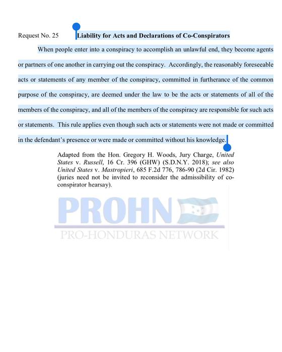 Dentro de los documentos liberados por la Corte del Distrito Sur de New York en relacion con el caso de Juan Antonio Hernández, la fiscalia con Emil J. Bove a la cabeza aseguran que establecerán por preponderancia de la evidencia que los acusados CC-3 (Porfirio Lobo Sosa), CC-4 (Juan Orlando Hernández), CC-5 (Ministro durante gobierno de Juan Orlando), y CC-6 (Primo de Juan Orlando y miembro de la Policia Nacional) fueron parte del complot de tráfico de droga de Tony Hernández, así como de un complot relacionado con la influencia en el tráfico de drogas para mantener y aumentar su poder político y control del Partido Nacional de Honduras.
