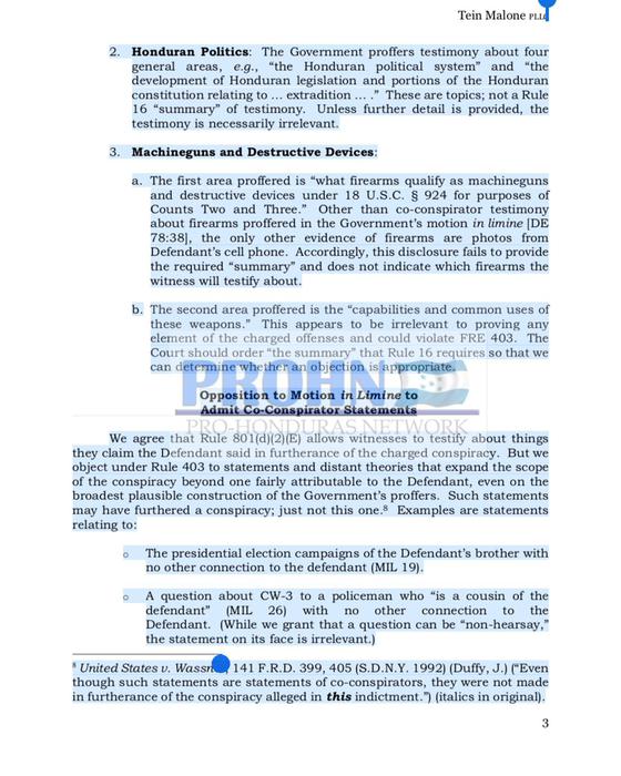 A pesar de anunciar la intención de presentar pruebas sobre «el sistema político hondureño», no se debe permitir que el Gobierno haga de este caso, un referéndum con jurado sobre la política hondureña. Asimismo, en virtud del artículo 403, debemos protegernos cuidadosamente contra un veredicto de «culpa por asociación», particularmente basado en rumores sobre el primo, hermano u otra familia del Demandado.