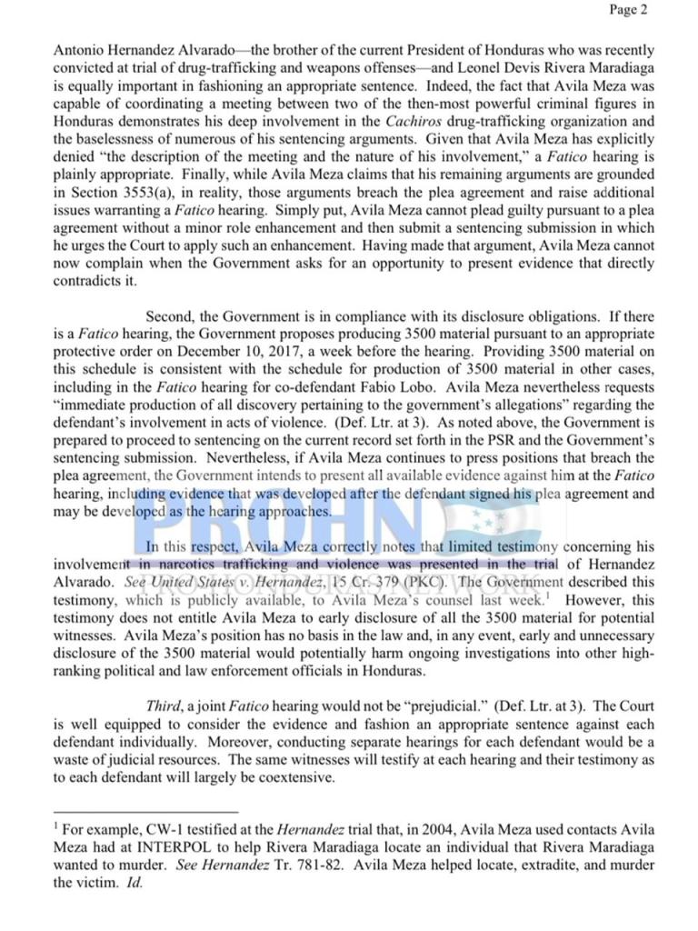 La defensa de Manuel Avila Meza se ha centrado en presentar al acusado como un miembro menor dentro de la conducta criminal, quien participó de manera esporádica en el trafico de drogas. Por su parte la fiscalía para el Distrito Sur de New York, envió una nota al juez Schofield especificando el nivel de participación que Avila Meza tuvo dentro del Cartel de Los Cachiros, siendo el enlace entre Devis Leonel Rivera Maradiaga y Juan Antonio Hernández Alvarado, para que estos programaran la famosa reunión en el restaurante «Deny’s» en la que trataron temas relacionados con el lavado de dinero de la empresa INRIMAR, a la que el Estado hondureño le debía fuertes sumas de dinero producto de contratos recibidos durante la gestión de Porfirio Lobo Sosa.