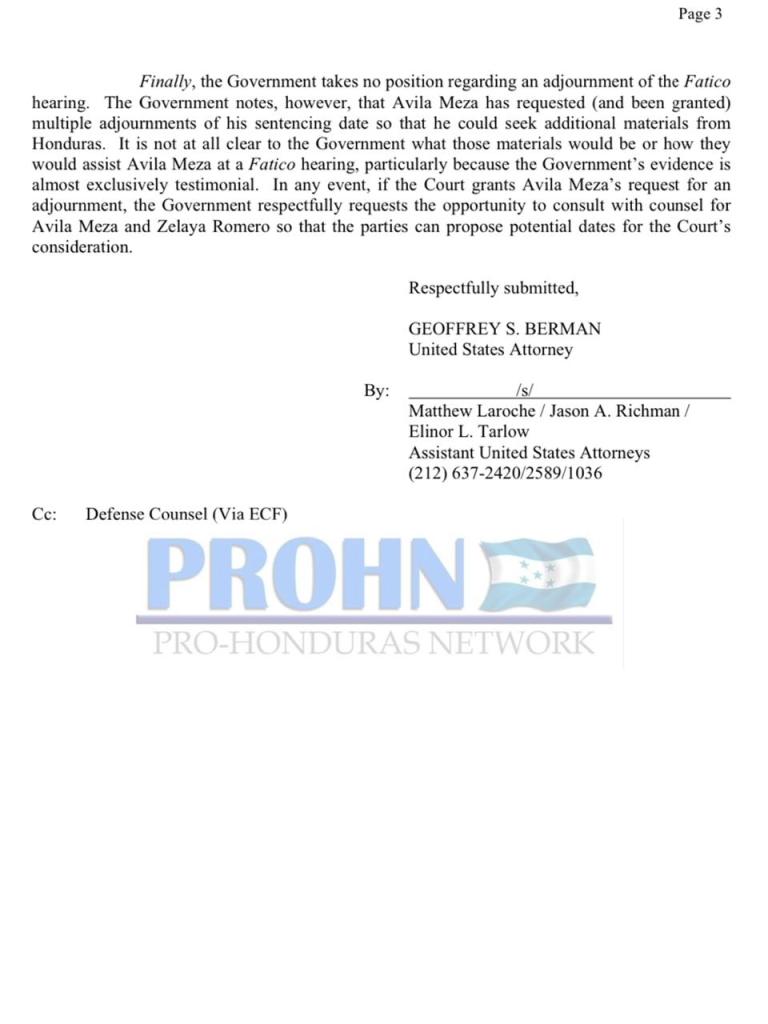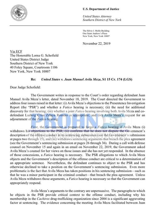 LA semana del 16 de diciembre se llevará a cabo en la Corte del Distrito Sur de New York, la audiencia Fatico (audiencia especial) contra Manuel Avila Meza y Ludwing Criss Zelaya Romero, ex policías acusados por delitos de trafico de drogas y trafico de armas .
