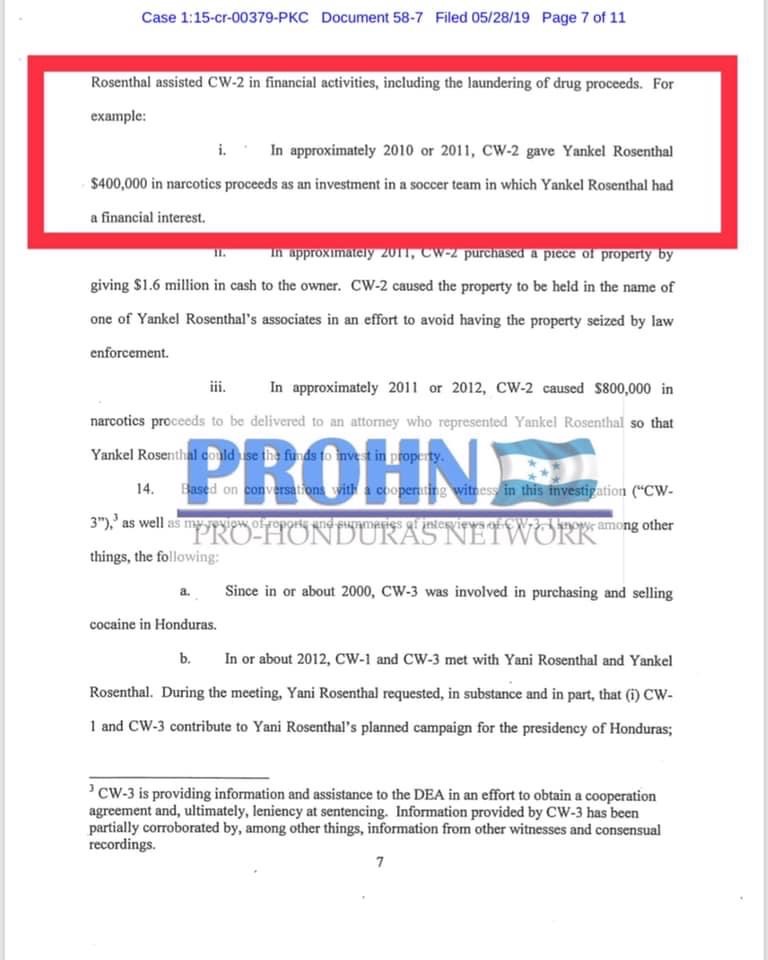 El pasado 28 de mayo de 2019 documentos desclasificados por la Corte del Distrito Sur en New York, revelan información que menciona a Yankel Rosenthal por haber recibido $400,000 dólares de parte de Carlos (El negro) Lobo, para invertir en el fútbol Hondureño.