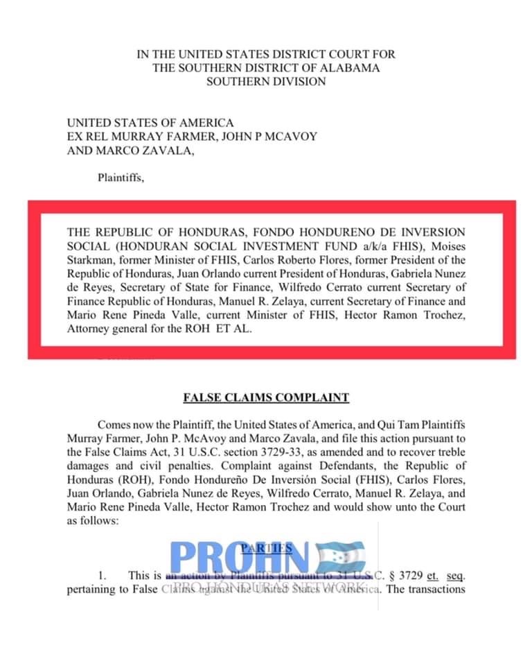 El demandante es el Gobierno de los Estados Unidos en nombre de Murray Farmer, John P. Mcavoy y Marco Zavala. Los demandados son La Republica de Honduras, Moises Starkman, Carlos Roberto Flores Facusse, Juan Orlando Hernández, Gabriela Núñez de Reyes, Wilfredo Cerrato, José Manuel Zelaya, Mario Rene Pineda Valle, Héctor Ramos Trochez, Fondo Hondureño de Inversión Social (FIHS) y ocho funcionarios de USAID.
