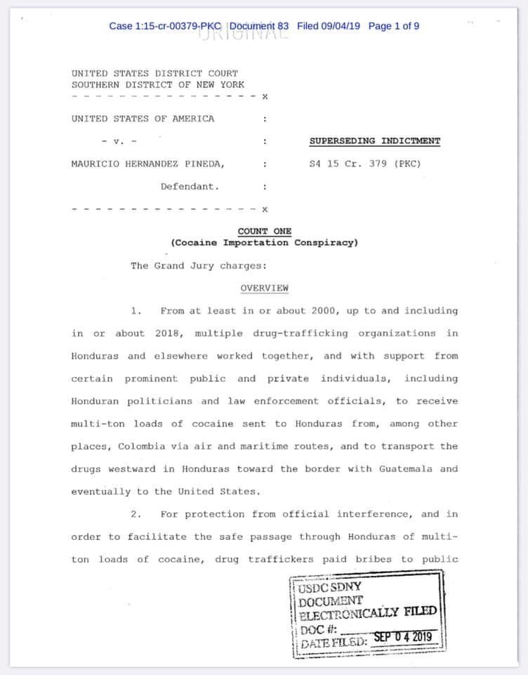 La orden de extradición se presenta luego de que, el 4 de septiembre de 2019 se presentaron cargos formales en la Corte del Distrito Sur de New York contra Hernández Pineda. La declaración del Departamento de Justicia de Estados Unidos dice lo siguiente: