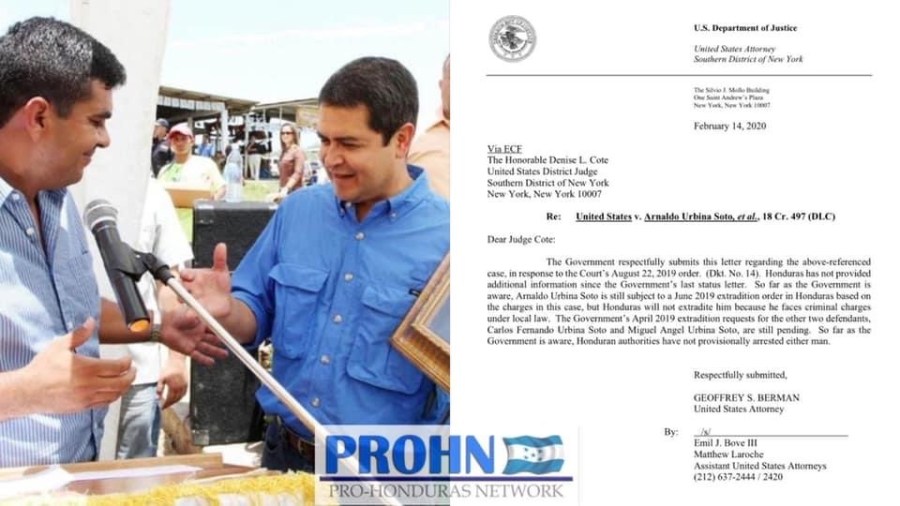 El pasado 14 de febrero de 2020, la Fiscalía para el Distrito Sur de New York envió una carta a la jueza Denise L. Cote, quien es la encargada de llevar el caso de Arnaldo Urbina Soto, Fernando Urbina Soto y Miguel Angel Urbina Soto, miembros del Cartel de los Urbina que operaba en el Departamento de Yoro.