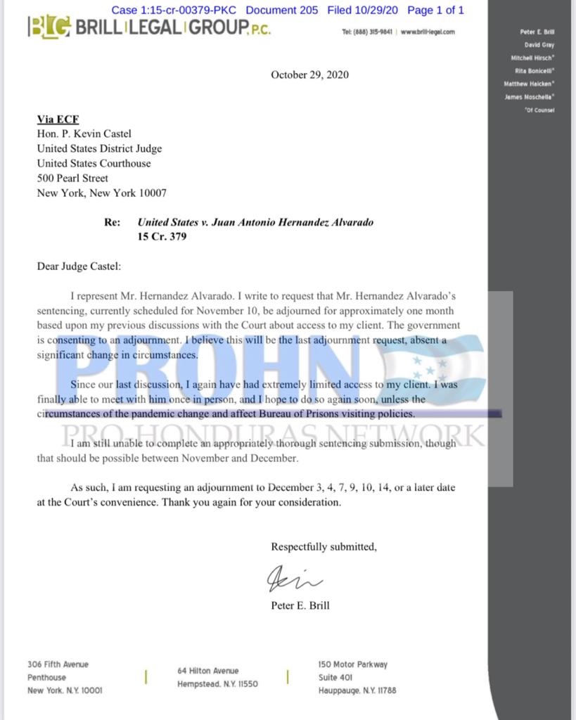 Por medio de una nota enviada al juez Kevin Castel, el abogado pro bono que esta a cargo del caso de Juan Antonio Hernández llamado Petter E. Brill , solicitó una nueva re programación de la audiencia en que se fijará la sentencia de Tony la cuál hasta el momento esta programada para el 10 de noviembre de 2020.