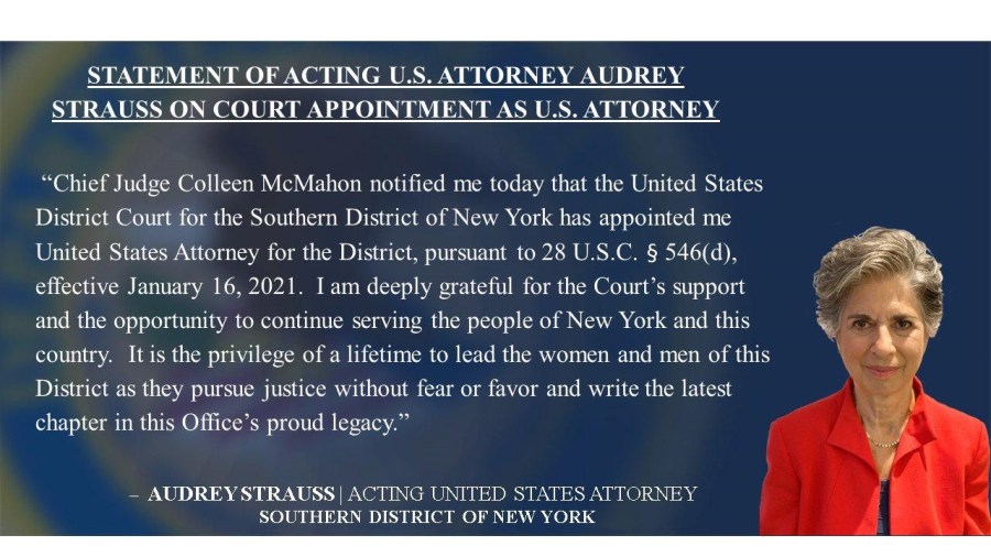 Según palabras de Strauss la juez Principal Colleen McMahon le notificó el día de ayer que el Tribunal de Distrito de los Estados Unidos para el Distrito Sur de Nueva York la ha designado Fiscal de los Estados Unidos para el Distrito, de conformidad con 28 USC § 546 (d), efectivo el 16 de enero de 2021. Al mismo tiempo expreso “Estoy profundamente agradecida por el apoyo de la Corte y la oportunidad de seguir sirviendo al pueblo de Nueva York y de este país. Es el privilegio de toda una vida liderar a las mujeres y hombres de este Distrito en su búsqueda de la justicia sin temor ni favoritismos y escribir el último capítulo del orgulloso legado de esta Oficina «.