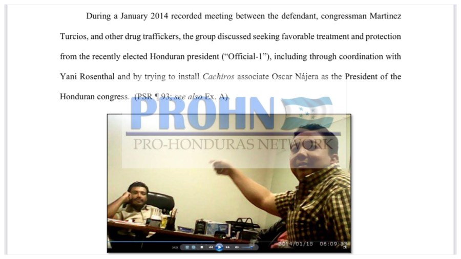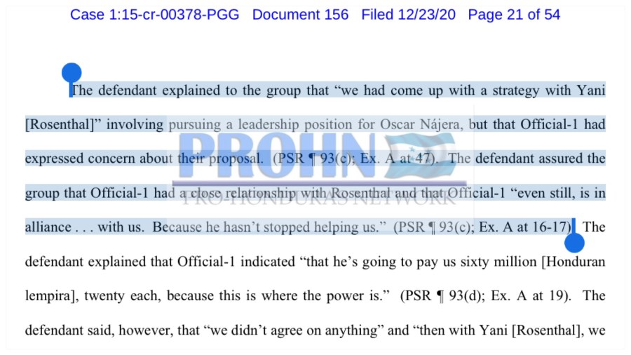 El acusado explicó al grupo que “habían ideado una estrategia junto a Yani [Rosenthal]” que involucraba buscar un puesto de liderazgo para Oscar Nájera, pero que Official-1 había expresado preocupación por su propuesta. (PSR ¶ 93 (c); Ex. A en 47). El acusado aseguró al grupo que Official-1 tenía una relación cercana con Rosenthal y que Official-1 “Seguirá en alianza… con nosotros, porque no va a parar de ayudarnos » (al mencionar al official-1 los documentos se refieren a Juan Orlando Hernández).