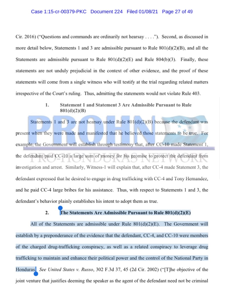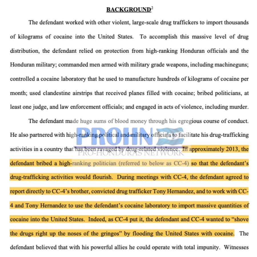 Dentro del documento la fiscalía afirma que aproximadamente en 2013, Geovanny Fuentes Ramírez sobornó a un político de alto rango (al que se hace referencia más adelante como CC-4) para que avanzaran exitosamente sus actividades de tráfico de drogas. Durante las reuniones con Juan Orlando Hernández, fuentes acordó informar directamente al hermano de Juan Orlando (CC-4), el narcotraficante convicto Tony Hernandez y trabajar junto a Tony Hernandez para usar el laboratorio de cocaína de Fuentes Ramírez para importar cantidades masivas de cocaína a los Estados Unidos. De hecho, como lo expresó Juan Orlando Hernández, él y Fuentes Ramírez querían “meter las drogas en las narices de los gringos” inundando los Estados Unidos con cocaína.