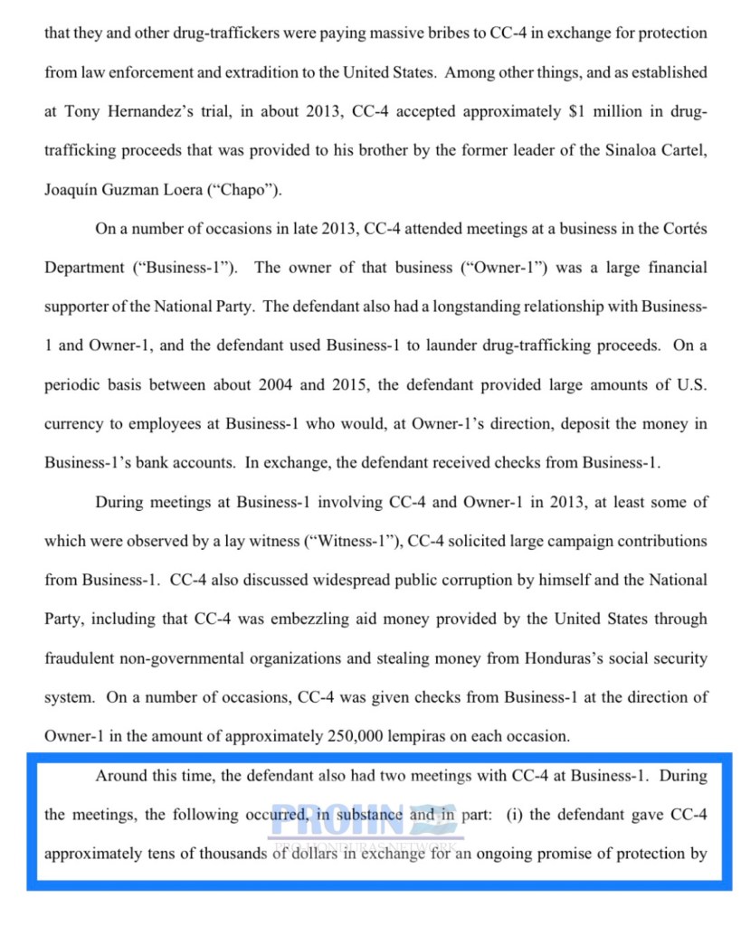La información revelada por la Fiscalía para el Distrito Sur de New York el pasado viernes 8 de enero, que surge dentro del caso de Geovanny Fuentes Ramírez afirma que Juan Orlando Hernández (CC-4) y Fuentes Ramírez sostuvieron múltiples reuniones en el departamento de Cortés, en las que hablaron de sus actividades de tráfico de drogas.