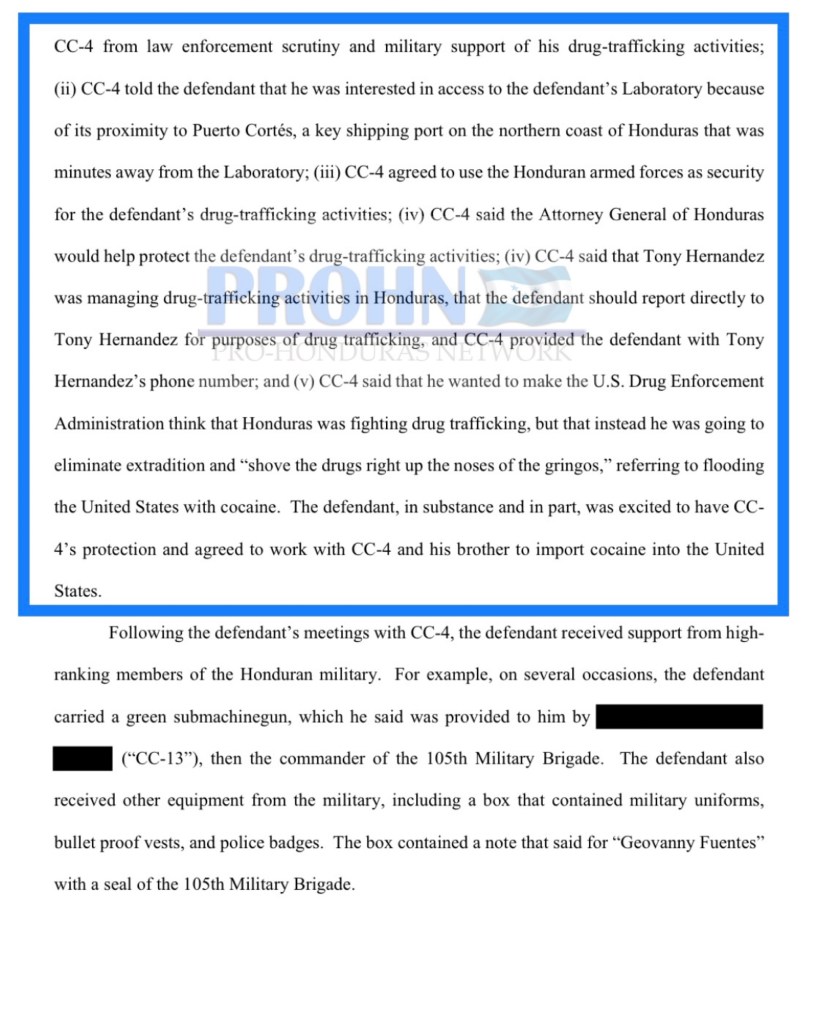 (v) Juan Orlando Hernández dijo que quería que la Administración de Control de Drogas de Estados Unidos (DEA) pensara que Honduras estaba luchando contra el narcotráfico, pero que en cambio iba a eliminar la extradición y «meter las drogas en las narices de los gringos», refiriéndose a inundar los Estados Unidos con cocaína. Geovanny Fuentes, en sustancia y en parte, estaba emocionado de tener la protección de Juan Orlando Hernández y acordó trabajar con el y su hermano para importar cocaína a los Estados Unidos.