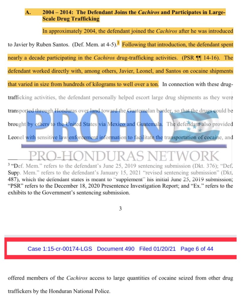 Documento 490, caso 1-15-cr-00174, página 5. 2004 – 2014: El acusado se une a los Cachiros y participa en el narcotráfico a gran escala