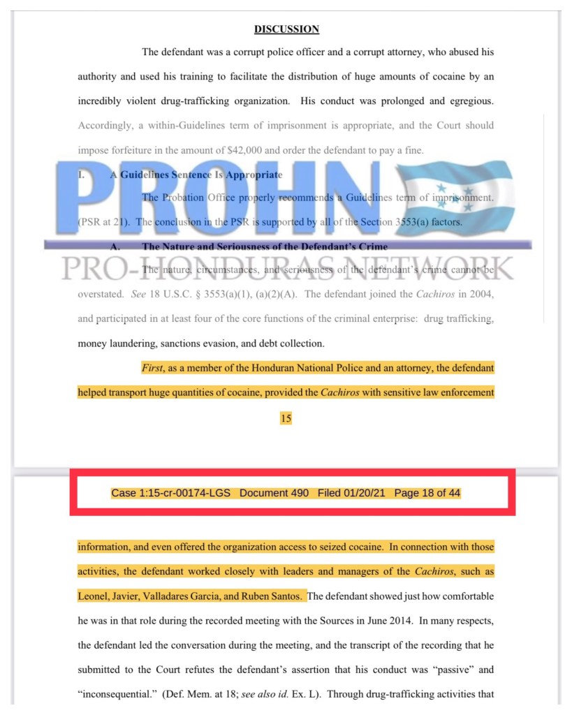 Primero, como miembro de la Policía Nacional Hondureña y como abogado, el acusado ayudó a transportar grandes cantidades de cocaína, proporcionó a los Cachiros Información sensible sobre los procesos de aplicación de la ley, e incluso ofreció a la organización acceso a la cocaína incautada. En relación con esas actividades, el acusado trabajó en estrecha colaboración con líderes y gerentes de Los Cachiros, como Leonel, Javier, Valladares García y Rubén Santos.