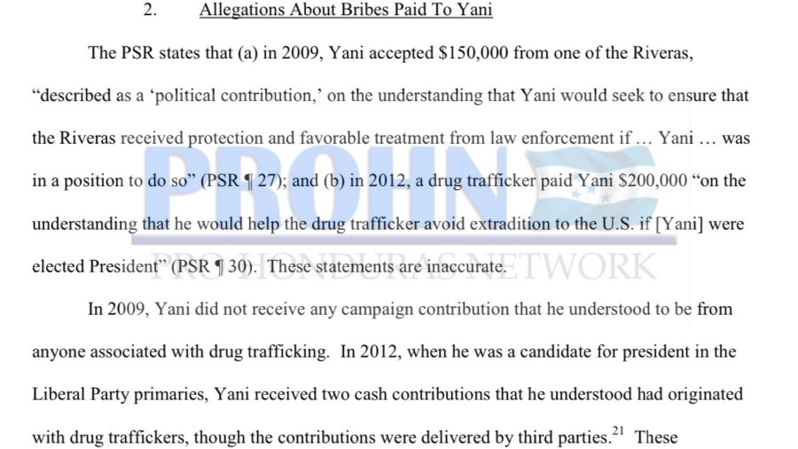 Para la fecha Yani aceptó haber recibido contribuciones en su campaña presidencial provenientes del Cartel de Los Cachiros y de Carlos Lobo alias «El negro Lobo», los documentos presentados por la fiscalía detallan el ingreso en el año 2012 de una contribución de $150,000 USD brindada por Javier Rivera Maradiaga, uno de los principales lideres del Cartel de Los Cachiros y una segunda aportación de $200,000 USD proveniente de Carlos «El negro lobo», dinero derivado de ganancias del trafico de drogas que pagaron «posiblemente» con la promesa de recibir protección en caso de que Rosenthal ganara las elecciones.