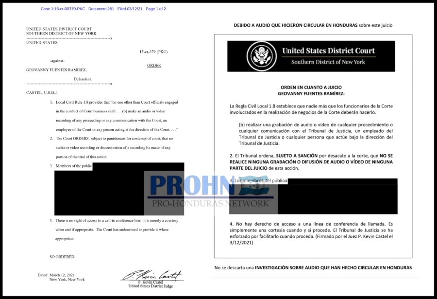 Luego de la filtración de audios en Honduras obtenidos durante el testimonio de Devis Leonel Rivera Maradiaga, el Juez Kevin Castel se pronuncia y ordena que no se realice ningún grabación de ningún tipo y estipula que compartir material proveniente de la Corte incurre en delito e incluso se puede considerar como obstrucción a la justicia: Se realizará una investigación sobre lo sucedido.