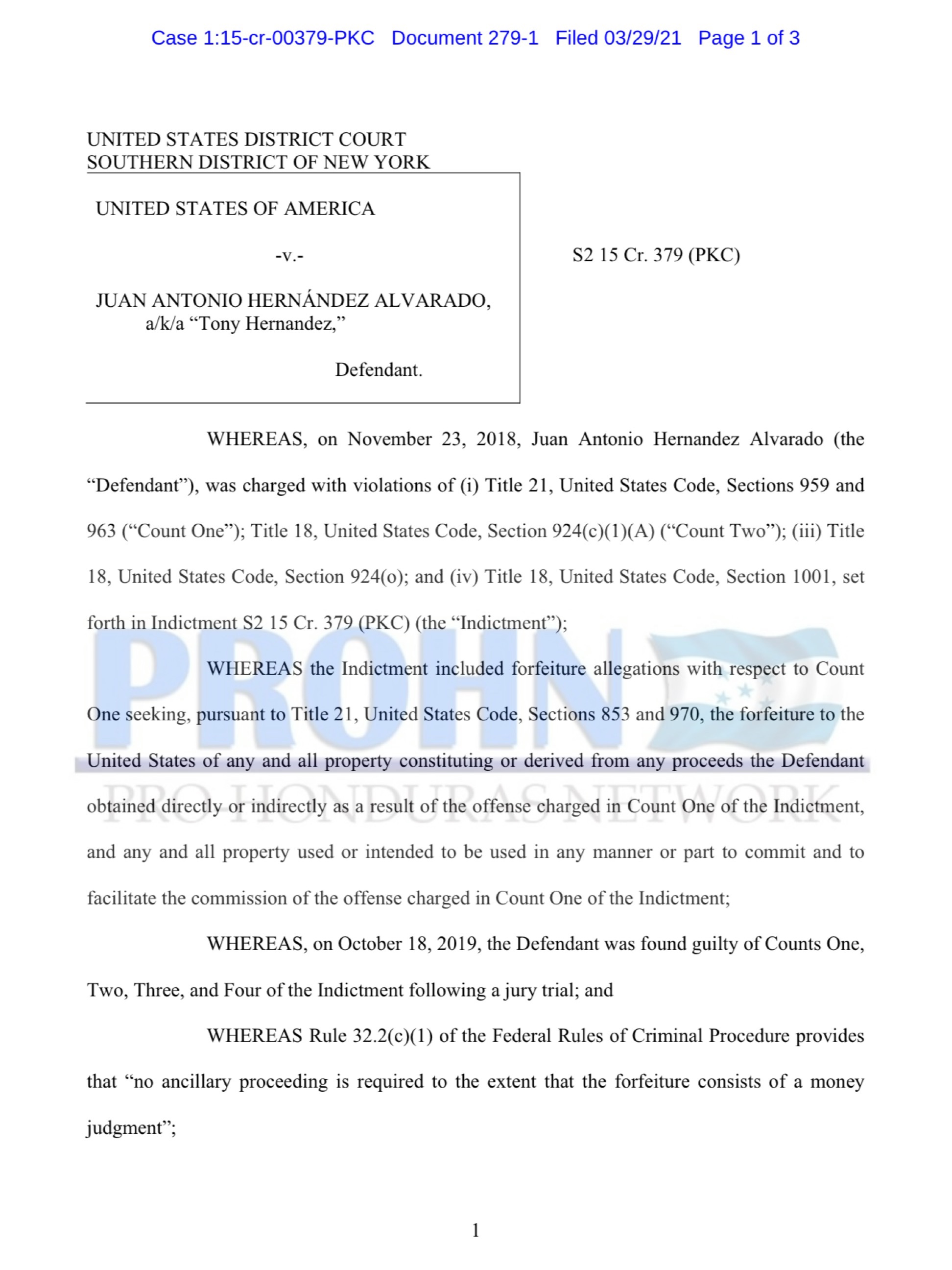 CONSIDERANDO que, el 23 de noviembre de 2018, Juan Antonio Hernández Alvarado (el «Demandado»), fue acusado de violaciones del (i) Título 21, Código de los Estados Unidos, Secciones 959 y 963 («Cargo uno»); Título 18, Código de los Estados Unidos, Sección 924 (c) (1) (A) (“Cargo Dos”); (iii) Título 18, Código de los Estados Unidos, Sección 924 (o); y (iv) Título 18, Código de los Estados Unidos, Sección 1001, establecido en la Acusación S2 15 Cr. 379 (PKC) (la «Acusación»);