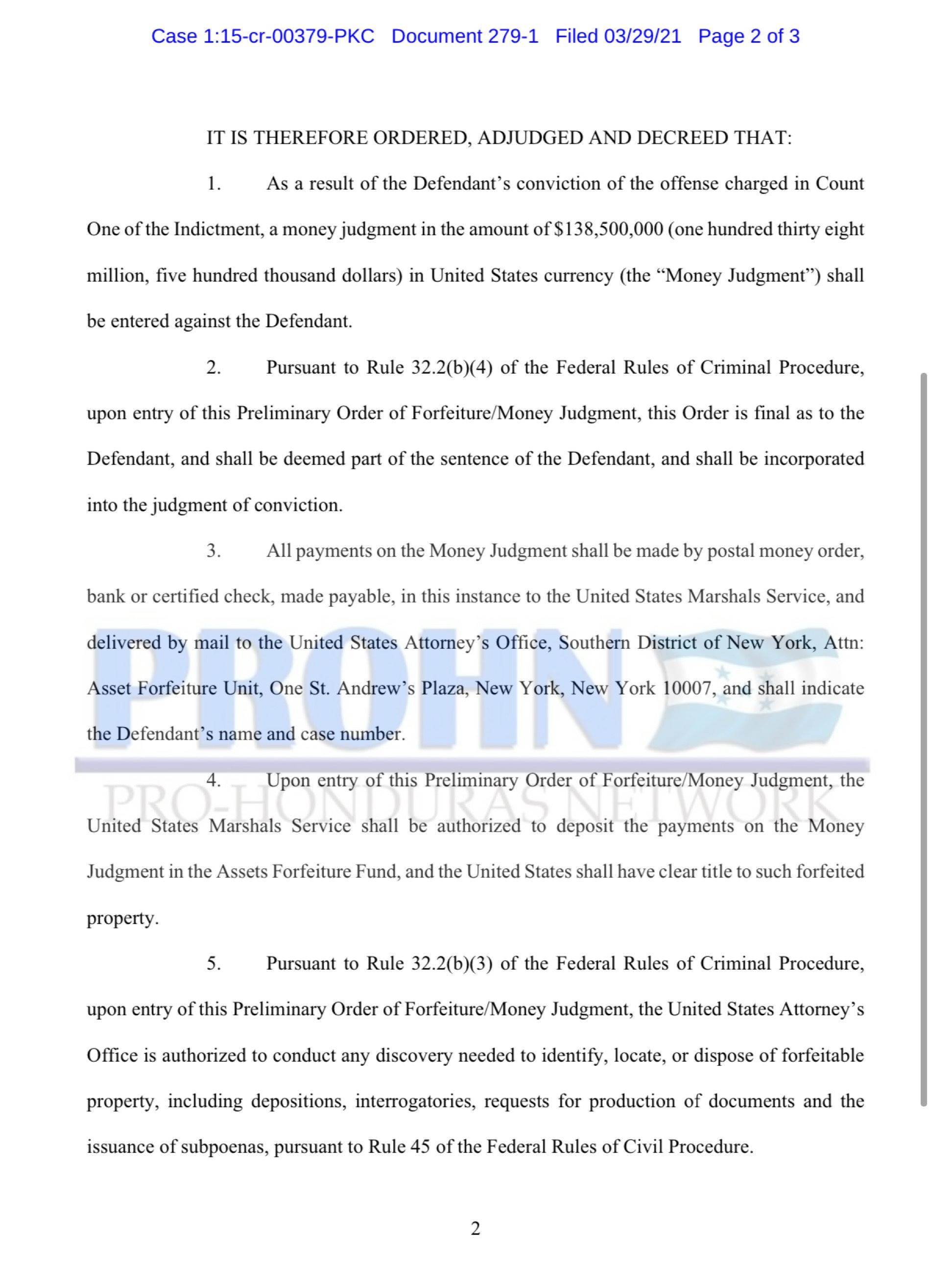 1. Como resultado de la condena del acusado por el delito en el cargo uno de la acusación, una sentencia monetaria por la cantidad de $ 138,500,000 (ciento treinta y ocho millones quinientos mil dólares) en moneda estadounidense (la «Sentencia monetaria» ) se presentará contra el Demandado.