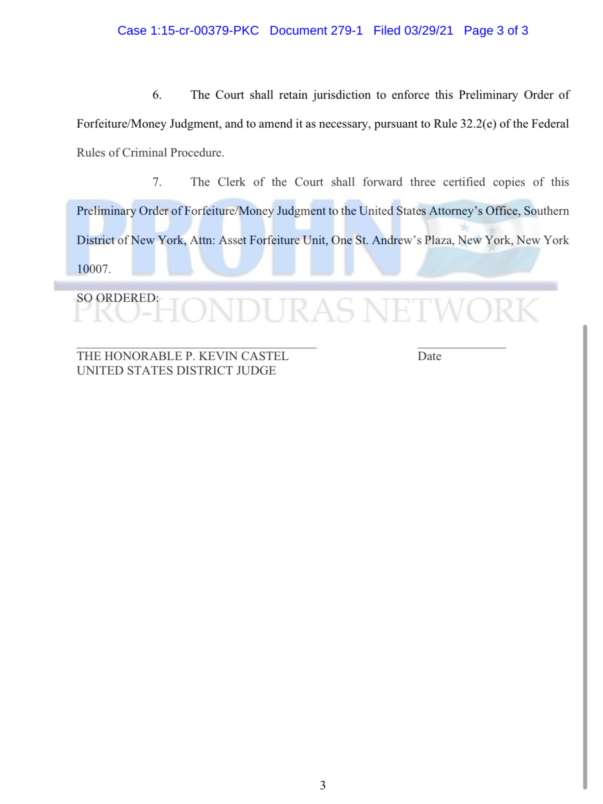 7. El Secretario del Tribunal remitirá tres copias certificadas de esta Orden preliminar de decomiso / Fallo de dinero a la Oficina del Fiscal de los Estados Unidos, Distrito Sur de Nueva York, a la atención de: Unidad de Confiscación de Activos, One St. Andrew’s Plaza, Nueva York, Nueva York 10007.
