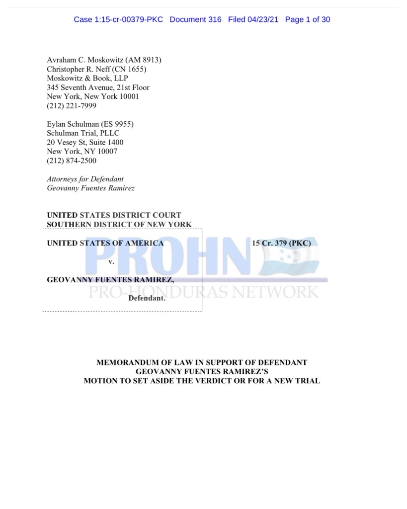 El día de hoy la defensa de Geovanny Fuentes envió un “memorándum of law” al juez Kevin Castel, en el que solicitan la realización de un nuevo juicio para su cliente, argumentando que la evidencia presentada en el caso de Fuentes Ramírez fue insuficiente para establecer su culpabilidad.