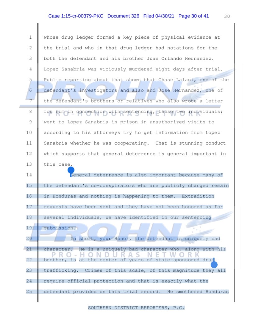 “Además, algunos de los co-conspiradores del acusado —incluido, en particular, su hermano— permanecen en Honduras, y hasta ahora han evitado la culpabilidad por sus propios delitos. Estos co-conspiradores podrían facilitar que el acusado vuelva a la delincuencia en caso de que salga de la cárcel. La disuasión general es aún más importante. Es comprensible que la audacia de los crímenes del acusado haya captado la atención del público en los Estados Unidos, Honduras y otras partes de América del Sur y Centro America. La sentencia de la Corte enviará un mensaje al público hondureño de que la justicia estadounidense no tolerará una conducta tan abominable”